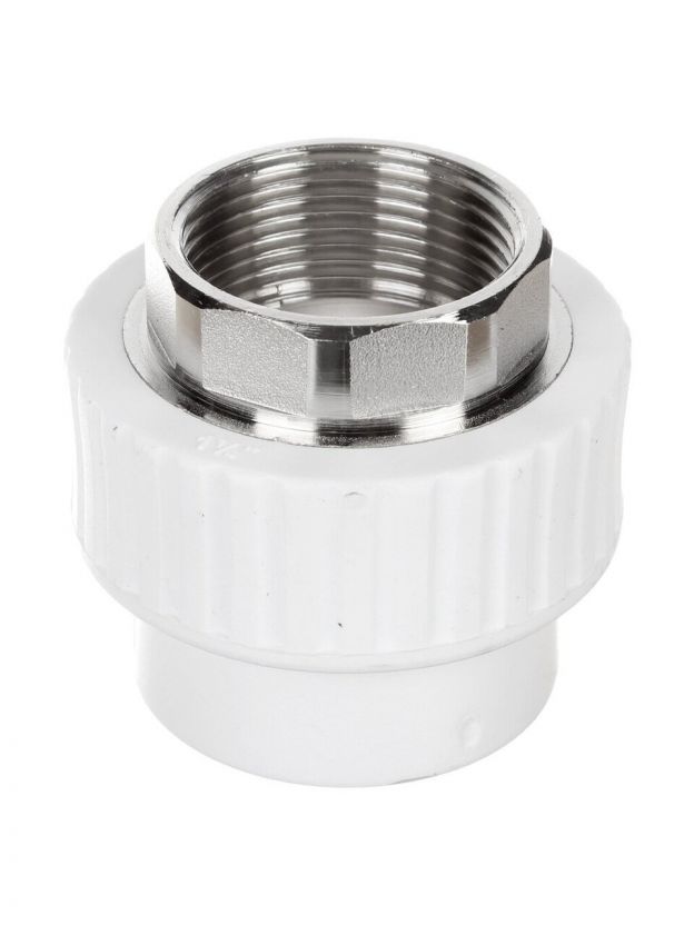 Муфта выполнена из полипропилена с латунной вставкой. Это обеспечивает прочность резьбы и стойкость к износу, в отличие от полностью пластиковых изделий, которые менее долговечны при высоких нагрузках.