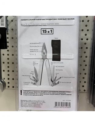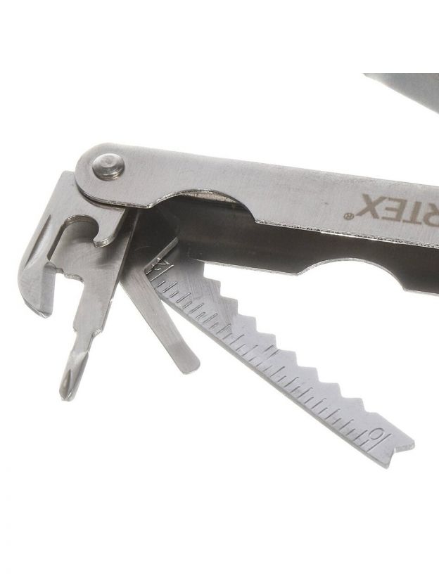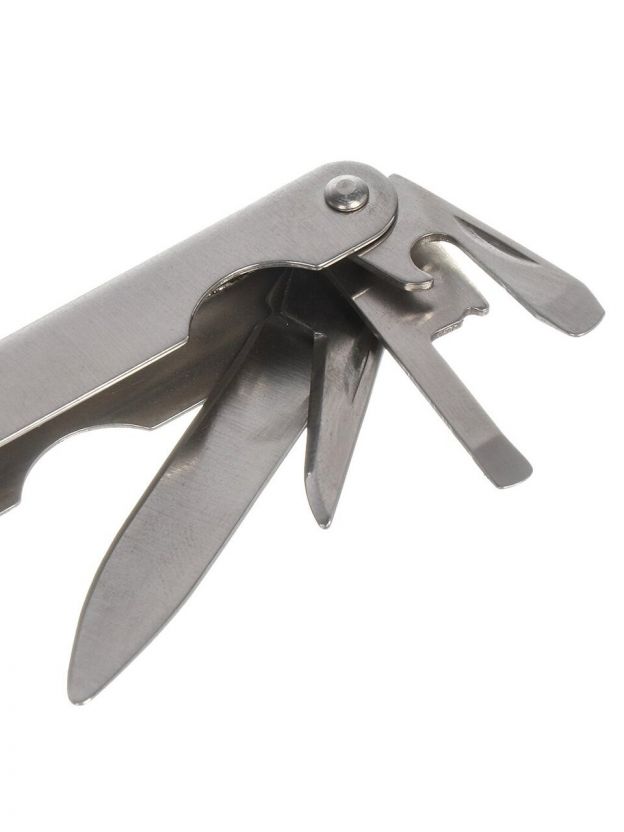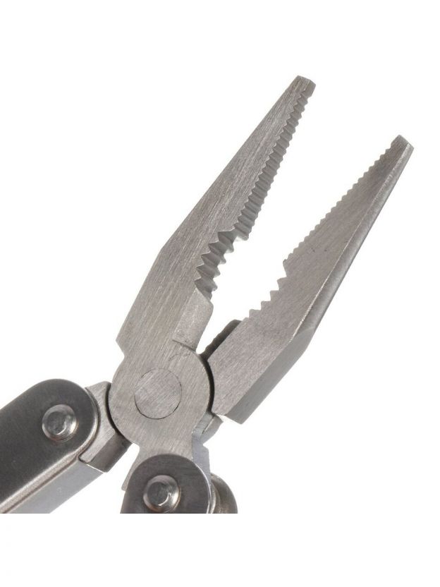 • Опции: щипцы длинные, плоскогубцы, захват круглых предметов, кусачки, нож большой, нож малый, отвертка малая, отвертка большая, нож консервный, открывалка для бутылок, отвертка крестовая, шило, линейка, напильник, нож для чистки рыбы.