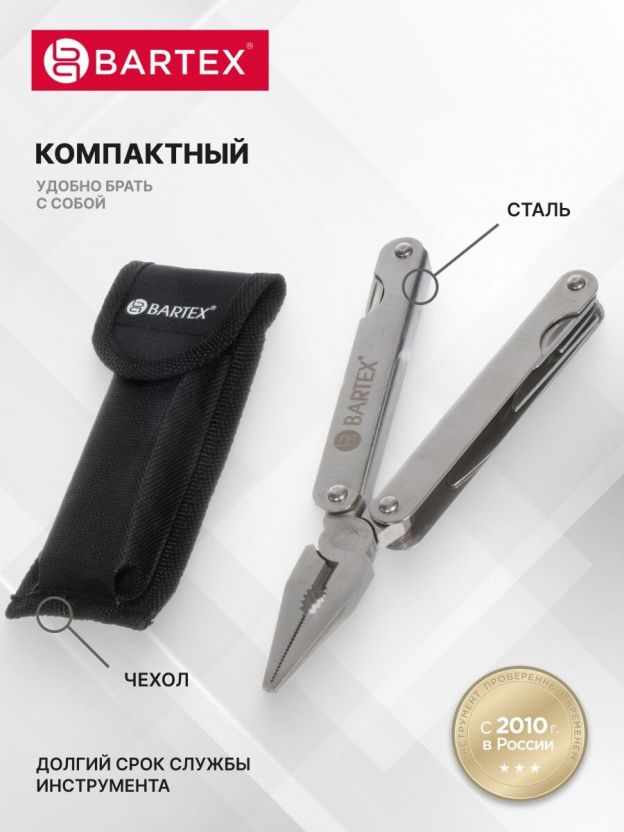 Мультитул Bartex выручит Вас в походе, на даче, в поездке, на охоте или рыбалке. Это невероятно удобно, когда Вы находитесь вдали от своей домашней мастерской, но все равно имеете доступ к самым необходимым инструментам. Если Вам требуется несложный ремонт здесь и сейчас, мультитул Bartex – лучшее решение.