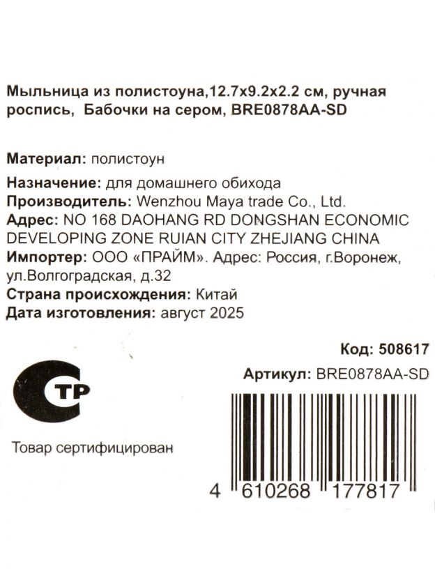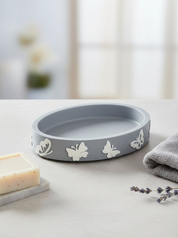 Мыльница настольная «Бабочки на сером» — стиль и практичность для ванной: долговечный полистоун, компактный размер, идеальный подарок для дома и дачи.