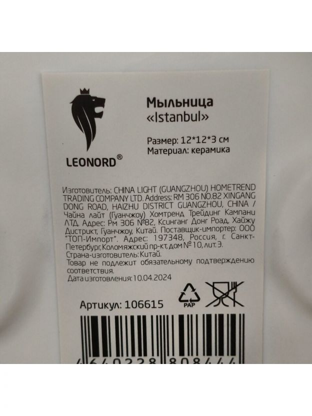 Мыльница настольная, Leonord, Istanbul, керамика, 12х12х3 см, 106615