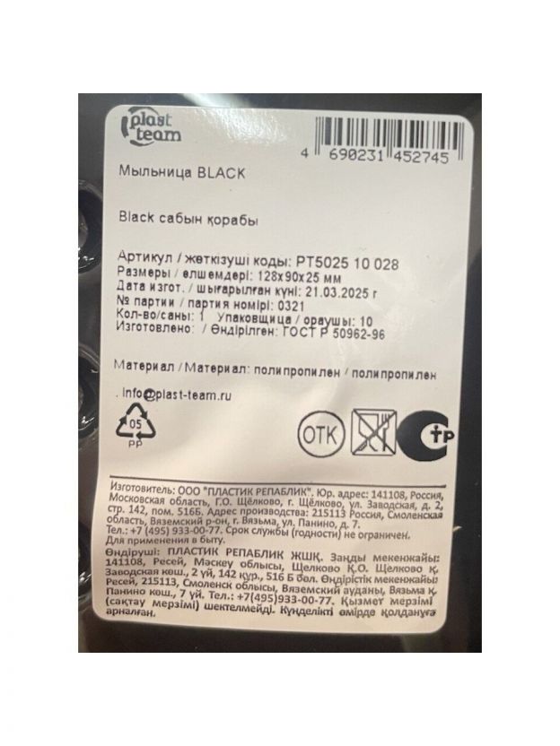 Мыльница настольная, Plast team, Black, пластик, 12.8х9х2.5 см, черная