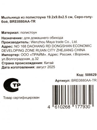 Мыльница выполнена из полистоуна — это прочный, влагостойкий материал, который не боится воды и легко очищается. Полистоун устойчив к механическим повреждениям, не впитывает запахи и не теряет цвет.