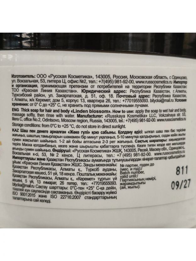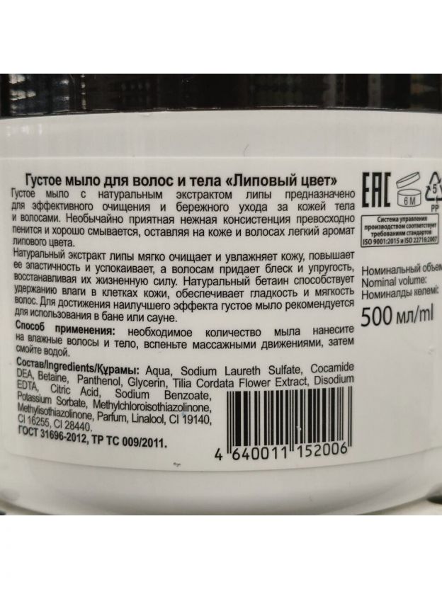 Густое мыло с натуральным экстрактом липы предназначено для эффективного очищения и бережного ухода за кожей тела и волосами. Необычайно приятная консистенция превосходно пенится и хорошо смывается, оставляя на коже и волосах легкий и тонкий аромат липового цвета.