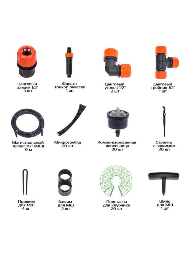 - 95 предметов из износостойкого пластика, шаг капельницы 20 см, рассчитан на 20 кустов.