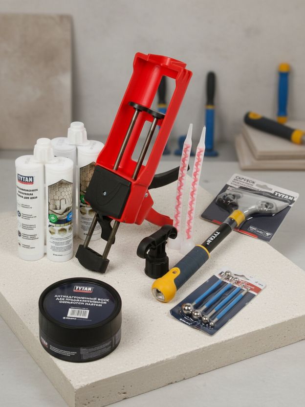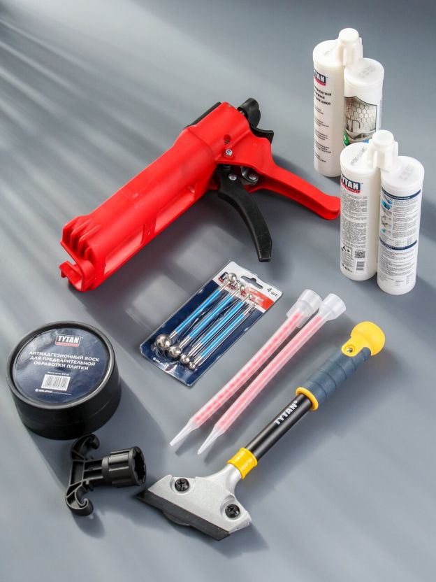 • Полный комплект: всё необходимое для профессиональной затирки — эпоксидная смесь, шпатели, скребок, воск и механический пистолет.