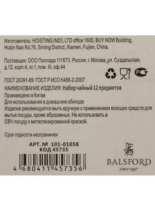 Набор чайный фарфор, 12 предметов, на 6 персон, 240 мл, Balsford, Фьюжн, 101-01058, подарочная упаковка