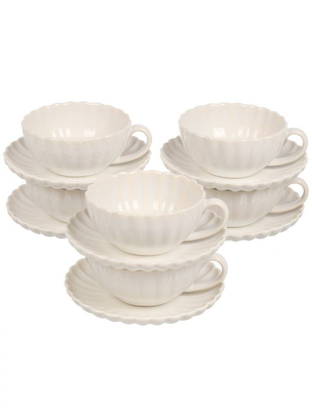В наборе 12 предметов (6 чашек и 6 блюдец), объём каждой чашки — 240 мл. Материал — керамика, цвет — белый, стиль — классический, без рисунка, с полосками. Производитель — Daniks, коллекция Moon Style, артикул ZPX222301W-1.