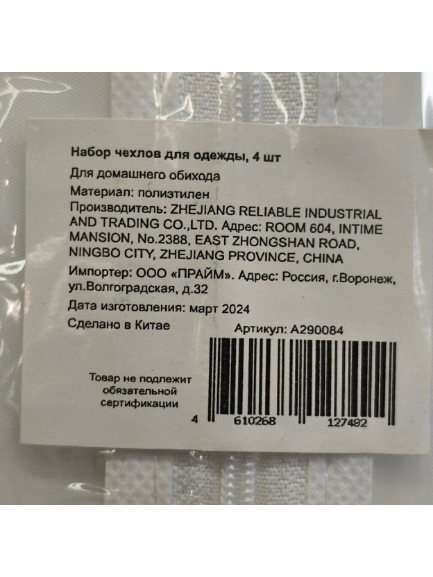 Набор чехлов полиэтилен, для одежды, 4 шт, 60х80, 60х120 см, A290084