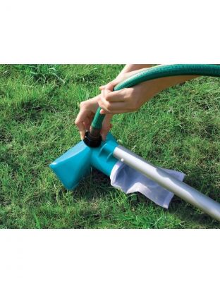 Пылесос подключается к садовому шлангу с помощью переходника, который идет в комплекте. Переходник вкручивается в верхнее отверстие пылесоса и на него надевается шланг.