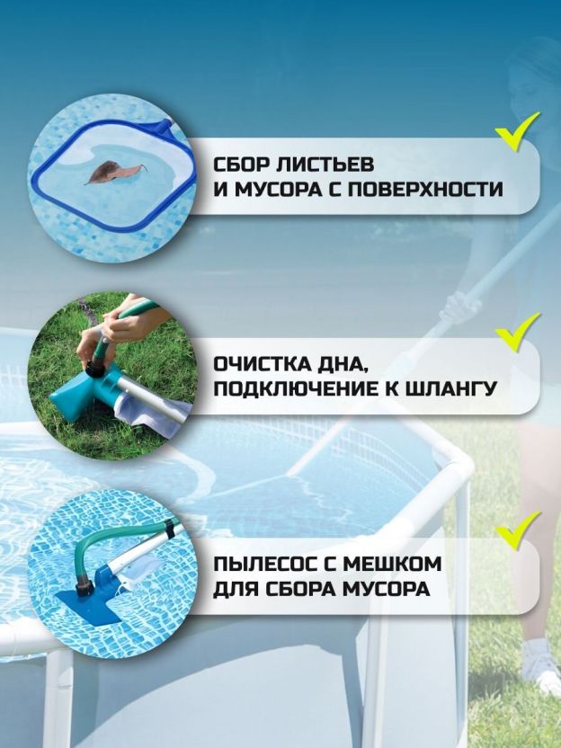 - эффективная очистка: набор включает все необходимое для поддержания чистоты бассейна;