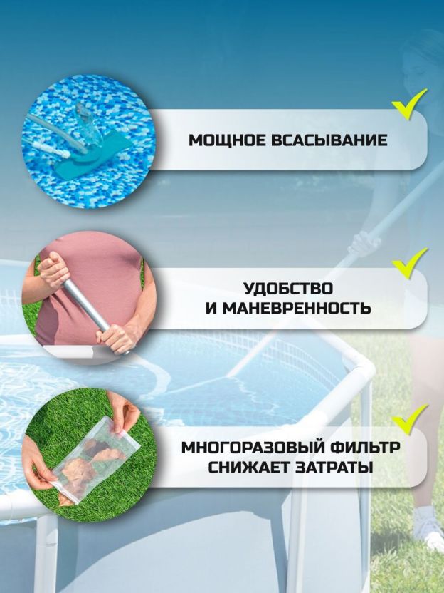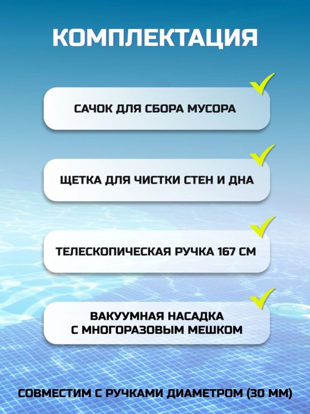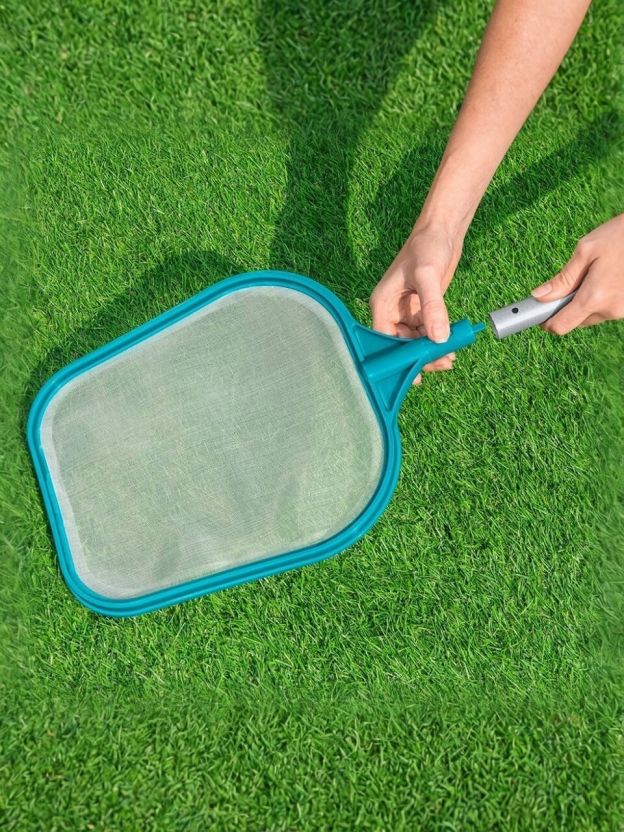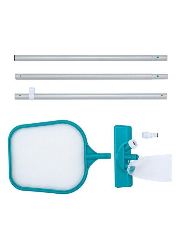 - Комплексный подход к чистке: в комплекте сачок, щетка и телескопическая трубка, которые обеспечивают полное удаление мусора и грязи с поверхности воды и стенок бассейна.