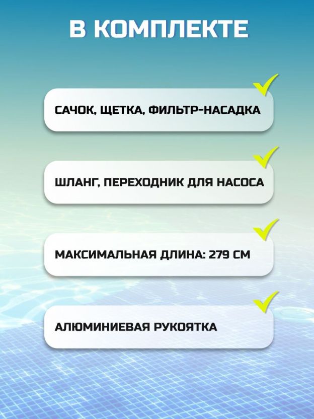 - комплексное решение для чистоты бассейна: включает все необходимые аксессуары для ухода за водой;