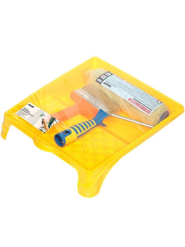 Купить всё и сразу? Легко! Набор малярный «АКОР» поможет осуществить задуманные переделки. Валик - нужный инструмент для строительства. Он поможет вам в покраске помещения, наклеивании обоев, в ином деле, связанном с ремонтом. Лоток предназначен для смешения строительной химии, выполнен из пластика, и его размер соответствует параметрам валика. Кисть отлично впитывает и распределяет лакокрасочные материалы и другие вещества по поверхности.