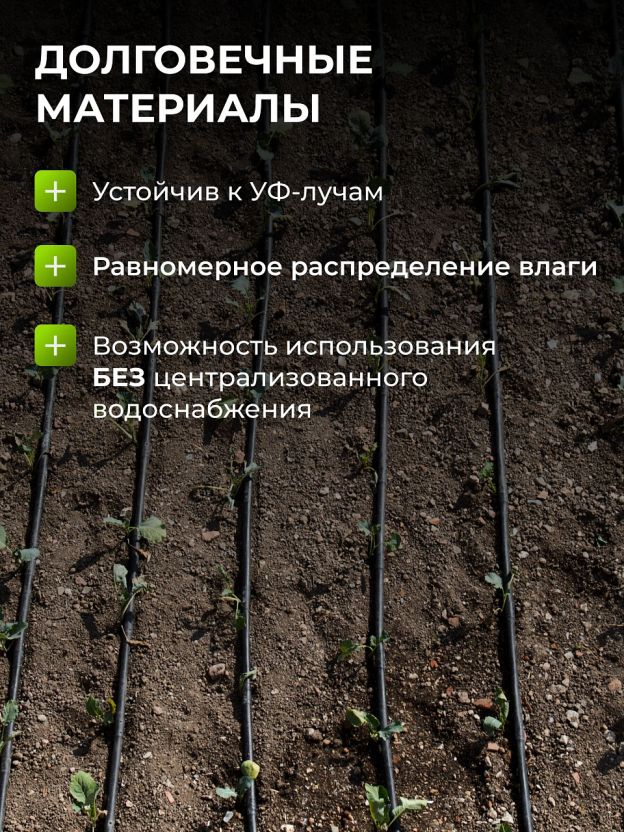 Установка комплекта занимает минимум времени и не требует специальных навыков. Диаметр подключения 1/2 дюйма позволяет легко интегрировать систему в существующую инфраструктуру участка. Максимальное давление 0,2 бар обеспечивает мягкую и деликатную подачу воды, предотвращая переувлажнение корней и минимизируя расход воды. Такой подход не только способствует экономии ресурсов, но и поддерживает оптимальные условия для выращивания овощей, ягод и декоративных культур.