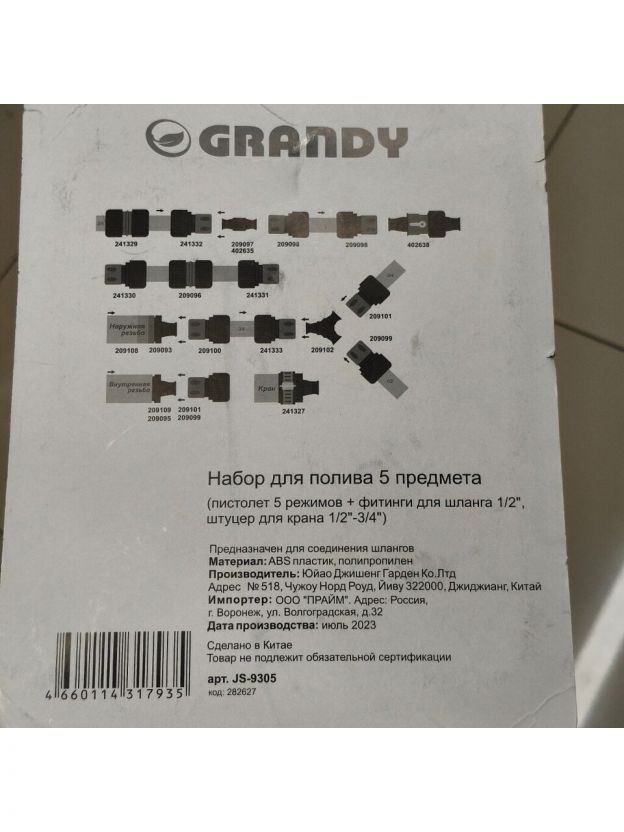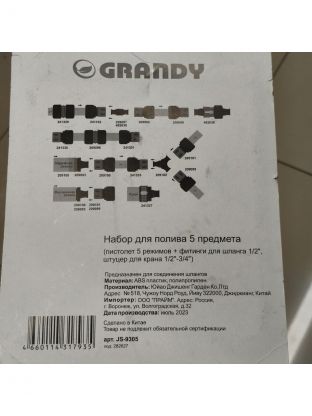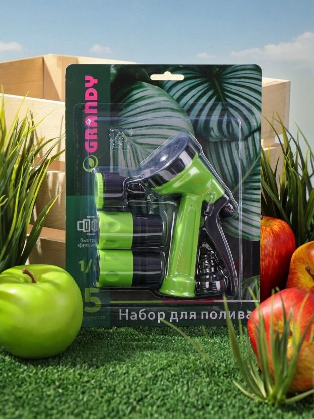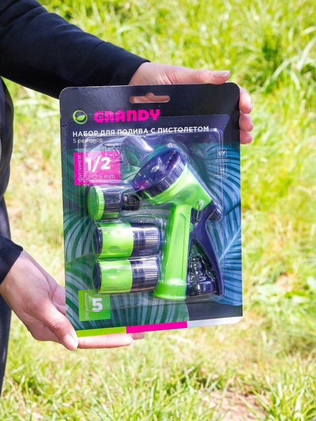 Набор для полива 5 предметов, пистолет 5 режимов, фитинги для шланга 1/2", штуцер для крана 1/2"-3/4", с наружней резьбой, Grandy, JS-9305