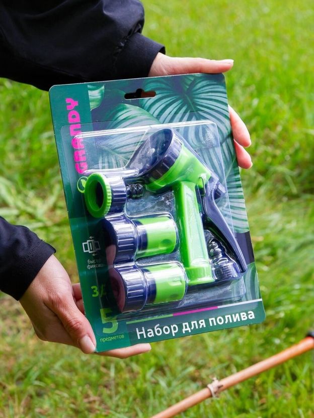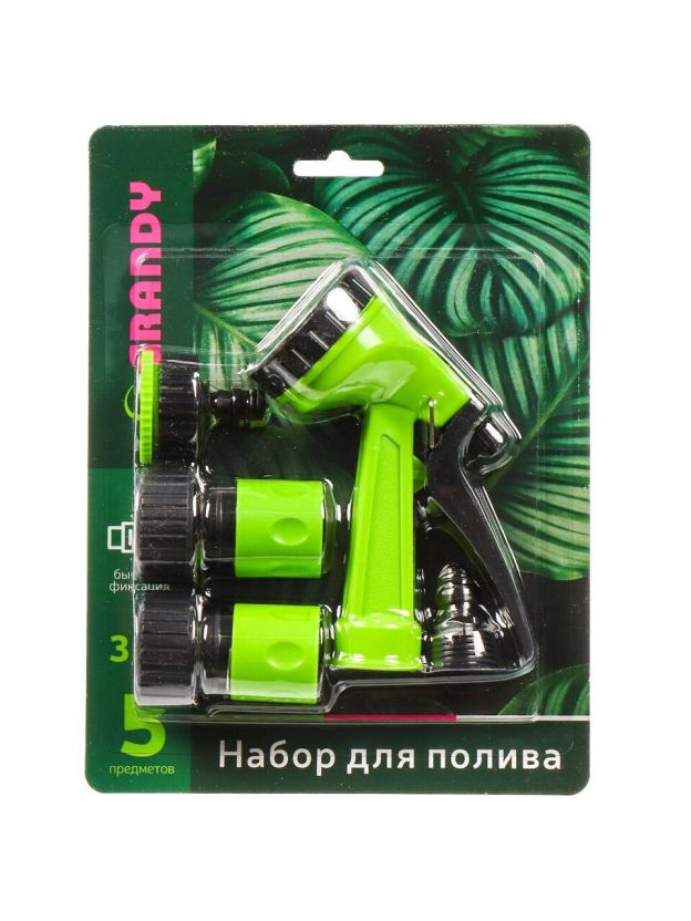 Набор для полива 5 предметов, пистолет 5 режимов, фитинги для шланга 3/4", штуцер для крана 1/2"-3/4", Grandy, JS-930534