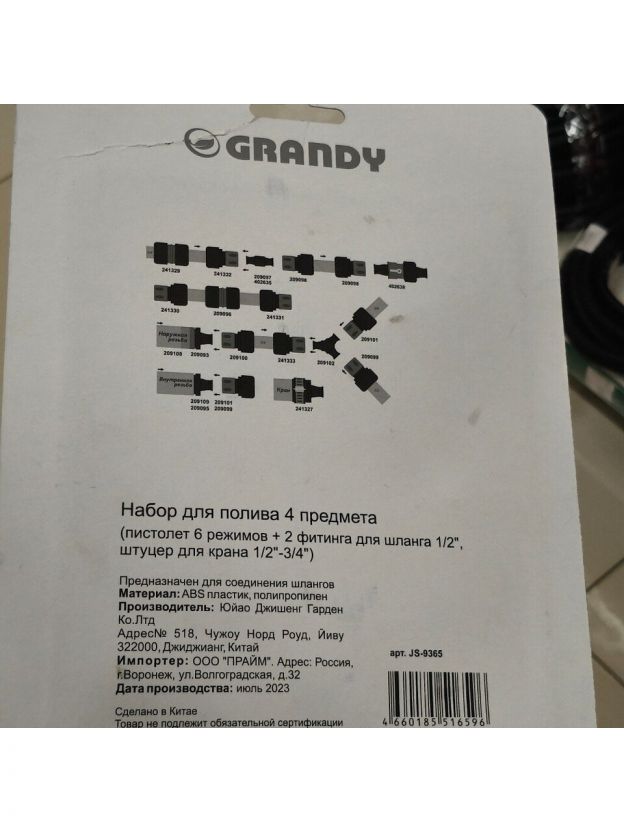 Набор для полива пистолет 6 режимов, фитинги для шланга 3/4", штуцер для крана 1/2"-3/4", с наружней резьбой, Grandy, JS-9366