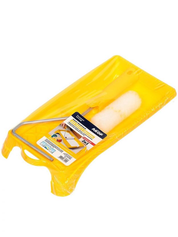 Купить всё и сразу? Легко! Набор малярный «АКОР» поможет осуществить задуманные переделки. Валик - нужный инструмент для строительства. Он поможет вам в покраске помещения, наклеивании обоев, в ином деле, связанном с ремонтом. Лоток предназначен для смешения строительной химии, выполнен из пластика, и его размер соответствует параметрам валика.