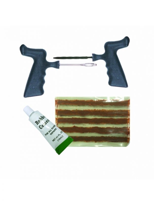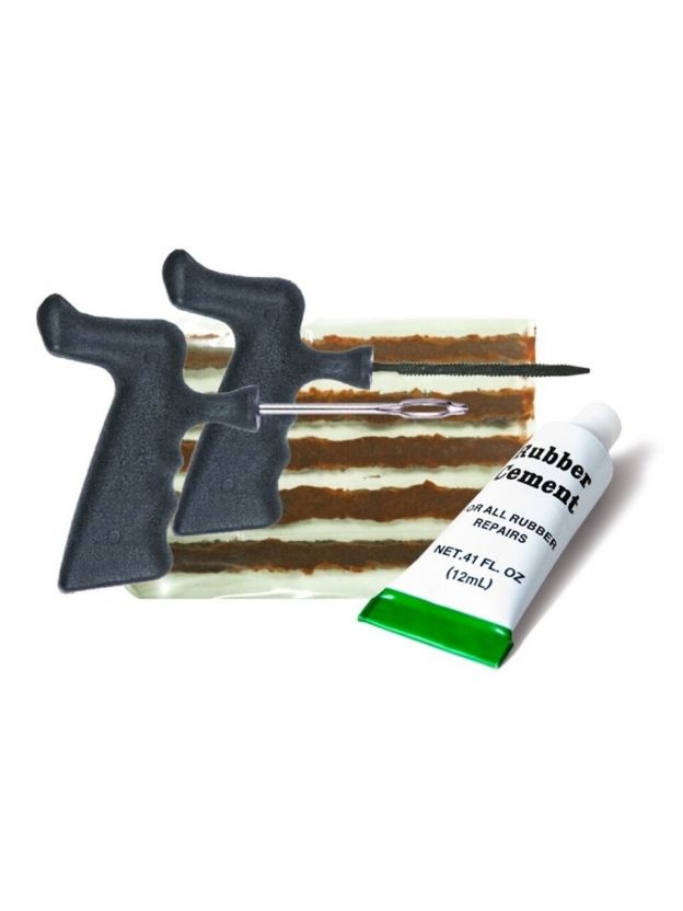 Незаменимый набор для современных автомобилистов. Позволяет устранить прокол бескамерной шины и продолжить поездку. Если диаметр отверстия не превышает 6 мм. вам не потребуется ехать в мастерскую — исправить ситуацию можно даже на обочине. Для устранения прокола вам нет необходимости демонтировать покрышку. Характеристики: Материал шила: сталь, ПВХ Материал жгута: резина. Длина жгута: 10,5 см. Состав клея: 70% органический растворитель, 25% каучук, 5% смола. Объем клея: 12 мл.