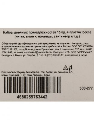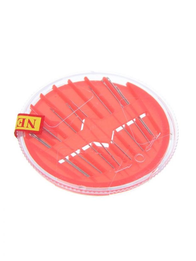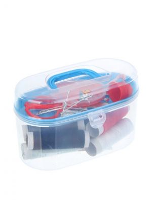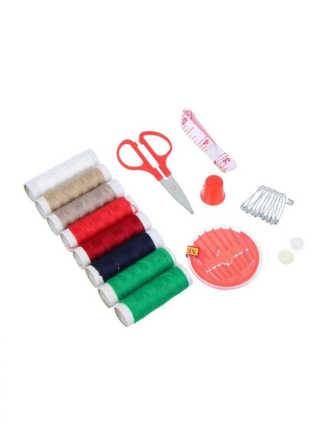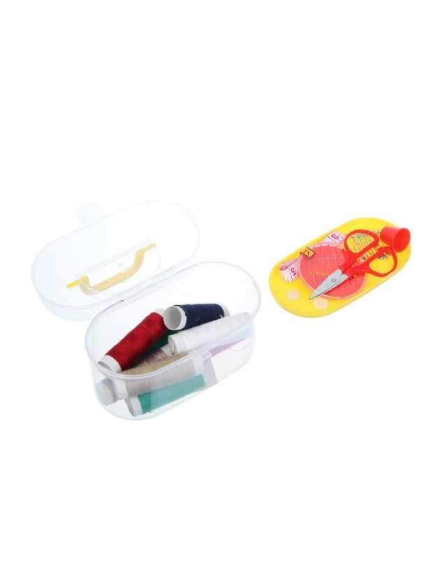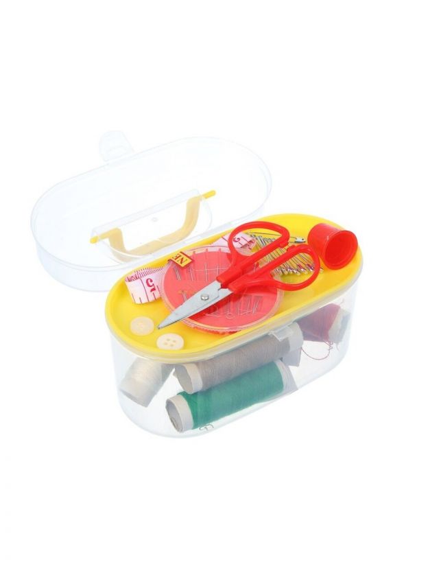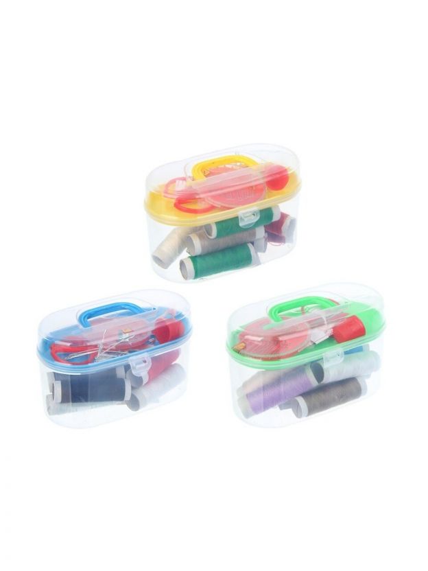 В наборе 15 предметов: нитки, иголки, ножницы, сантиметр и другие полезные аксессуары. Все размещены в прочном пластиковом боксе. Цвета ниток и аксессуаров — в ассортименте, без подбора по цвету.