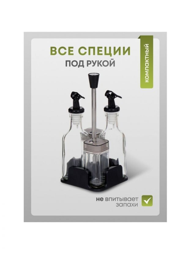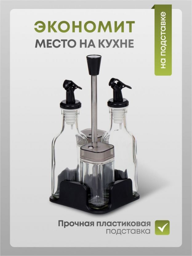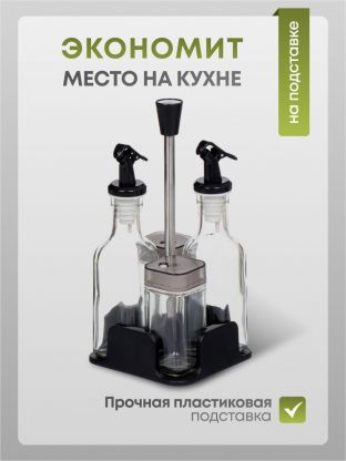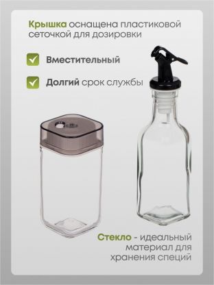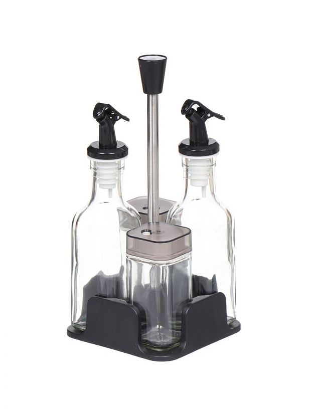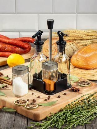 Этот набор - прекрасный пример высококачественной, удобной и лаконичной посуды для изящной сервировки стола. Бутылки и емкости для специй выполнены из стекла.