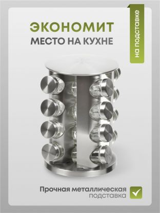 Удобный и практичный набор для специй обязательно станет полезным и незаменимым предметом Вашей кухни, ведь с его помощью Вы сможете хранить сразу несколько разнообразных видов специй. Готовить с таким набором будет намного удобнее, все необходимые добавки будут всегда под рукой. Набор для специй состоит из 16 баночек для специй и металлической подставки. Баночки изготовлены из стекла и оснащены плотно закручивающимися крышками из металла. Крышки снабжены пластиковыми сетками для дозировки. Набор идеально подойдет для хранения различных приправ и специй. Благодаря прозрачным стенкам можно видеть содержимое баночек. Такой набор стильно дополнит интерьер кухни и станет незаменимым помощником в приготовлении ваших любимых блюд.