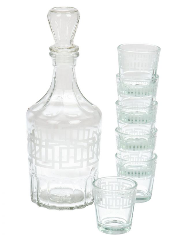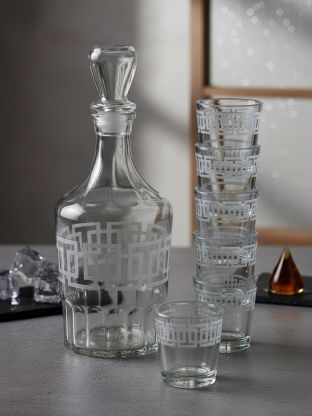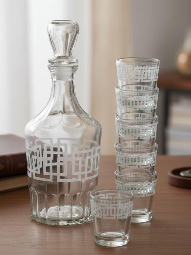 В комплекте 6 стопок по 50 мл каждая и графин. Материал — прозрачное стекло, устойчивое к царапинам и мытью в посудомоечной машине.