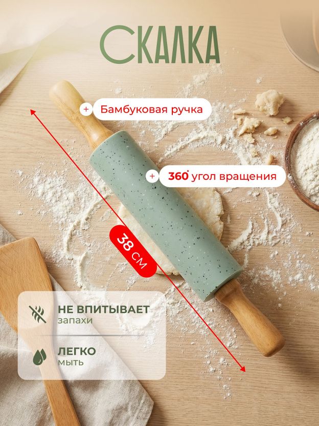 - оптимальный размер скалки — 38 см, подходит для работы с большим количеством теста;
