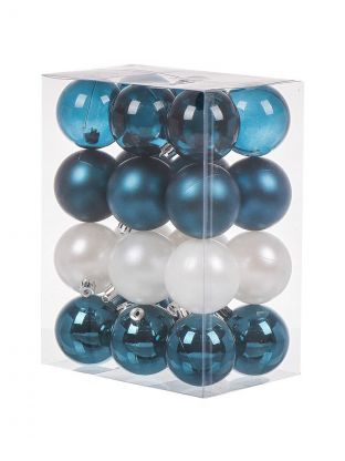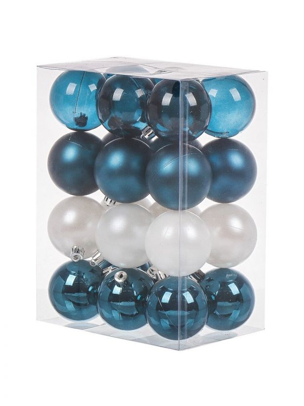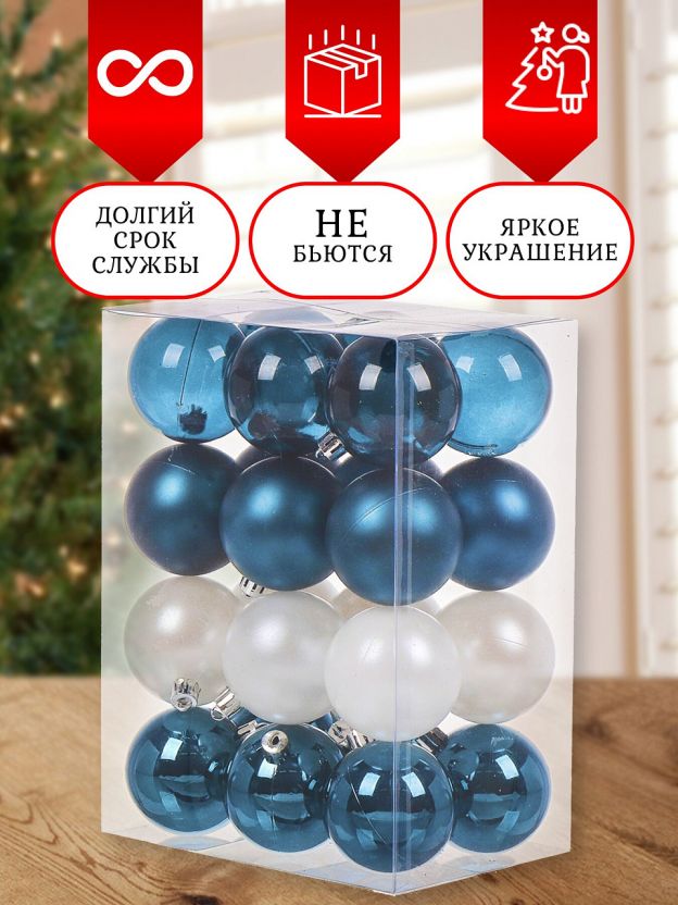 В наборе 24 шара диаметром 6 см, это компактный размер — украшения гармонично смотрятся как на стандартных, так и на небольших елках.