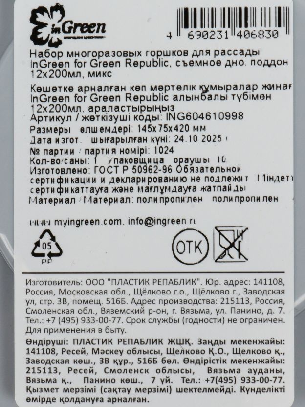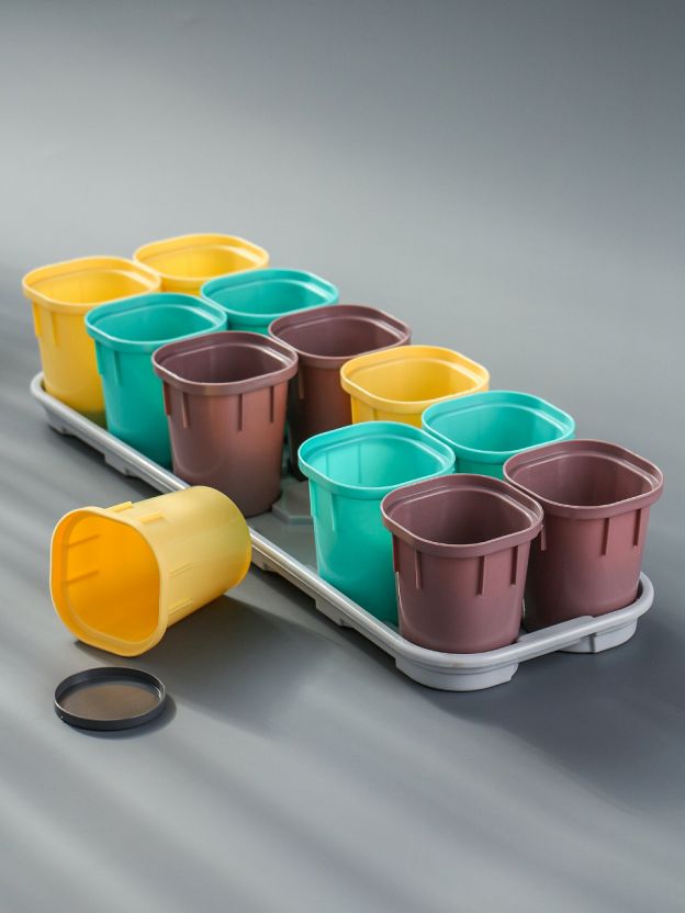 Набор горшков для рассады 12 шт, 200 мл, for Green Republic, с поддоном, в ассортименте, InGreen