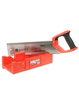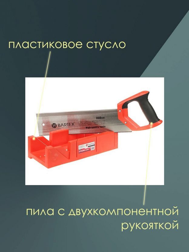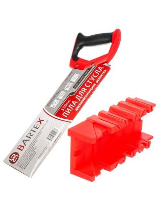 Набор Bartex позволяет надежно зафиксировать заготовку, а также точно пропилить ее под углом 45° или 90°. Максимальная толщина обрабатываемой заготовки составляет 40 мм. Набор включает в себя прочное пластиковое стусло и пилу с двухкомпонентной рукояткой пистолетного типа.