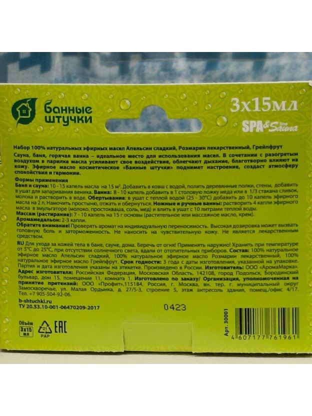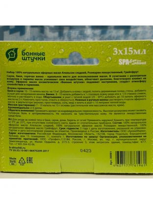Устали от городской суеты и хотите окунуться в мир спокойствия и гармонии? Набор эфирных масел для бани - идеальное решение для Вас. Набор включает в себя три флакончика по 15 мл каждый с маслами апельсина, грейпфрута и розмарина.