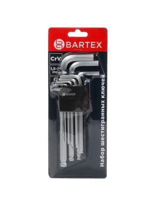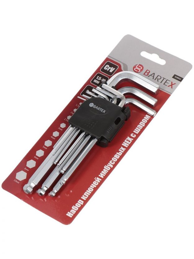 Набор ключей имбусовых, шестигранник, 9 предметов, Bartex, 1.5-10 мм, CrV сталь, удлиненные с HEX шаром, пластиковый держатель