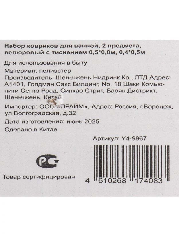 В комплекте два коврика: большой — 50x80 см, малый — 40x50 см. Оба прямоугольной формы, подходят для ванной и туалета.