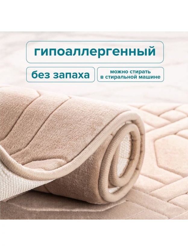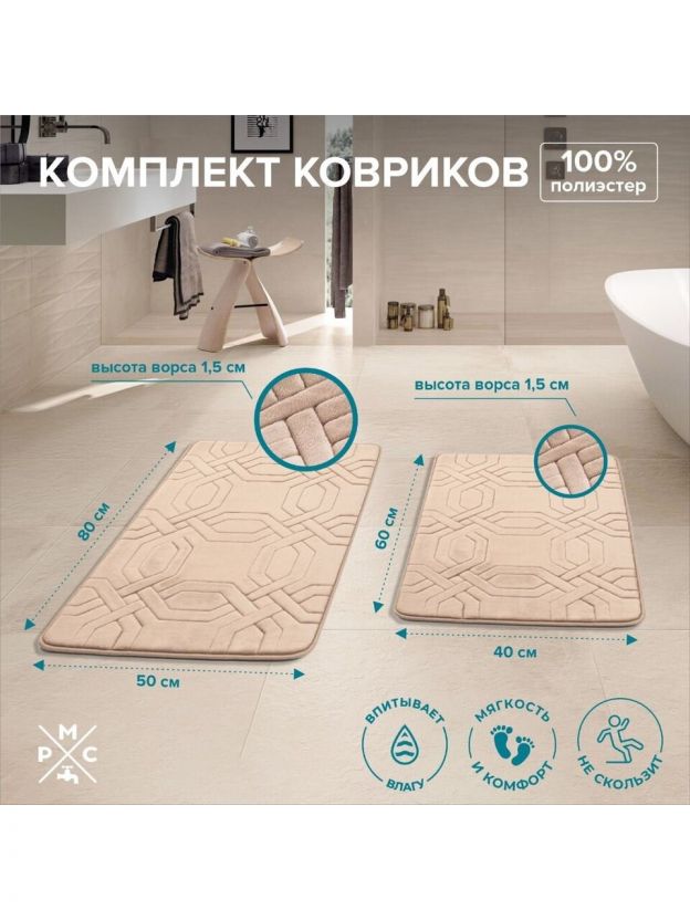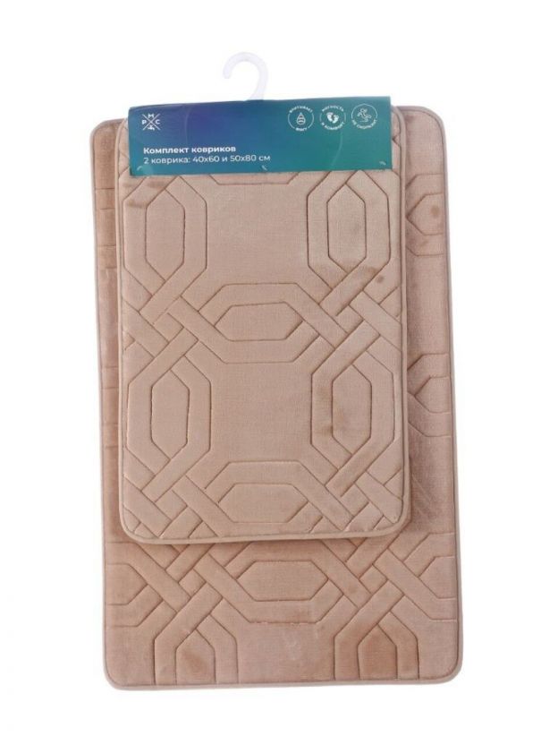 Набор ковриков для ванной и туалета, антискользящий, 2 шт, 0.4х0.6, 0.5х0.8 м, бежевый, РМС, КК-09БЖ-40х60/50х80