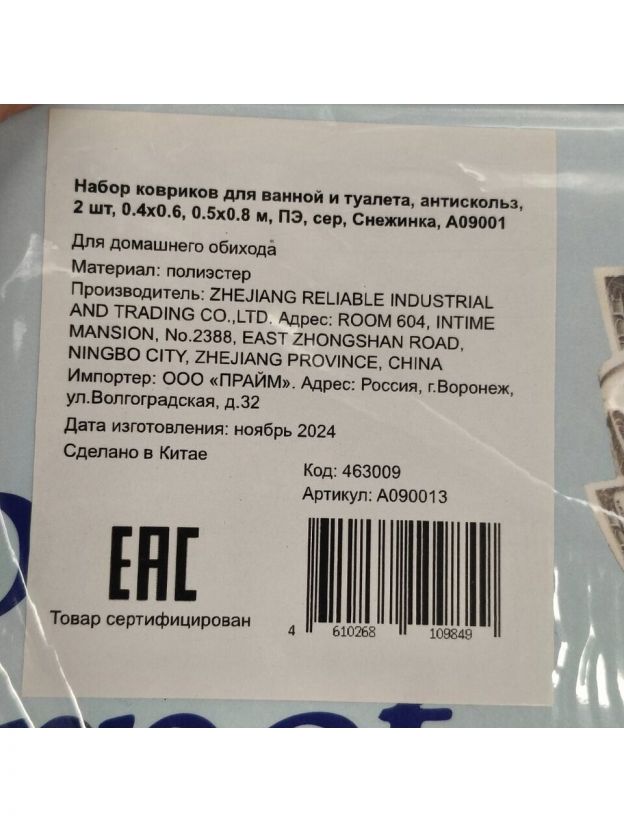 Набор ковриков для ванной и туалета, антискользящий, 2 шт, 0.4х0.6, 0.5х0.8 м, полиэстер, серый, Снежинка, A090013