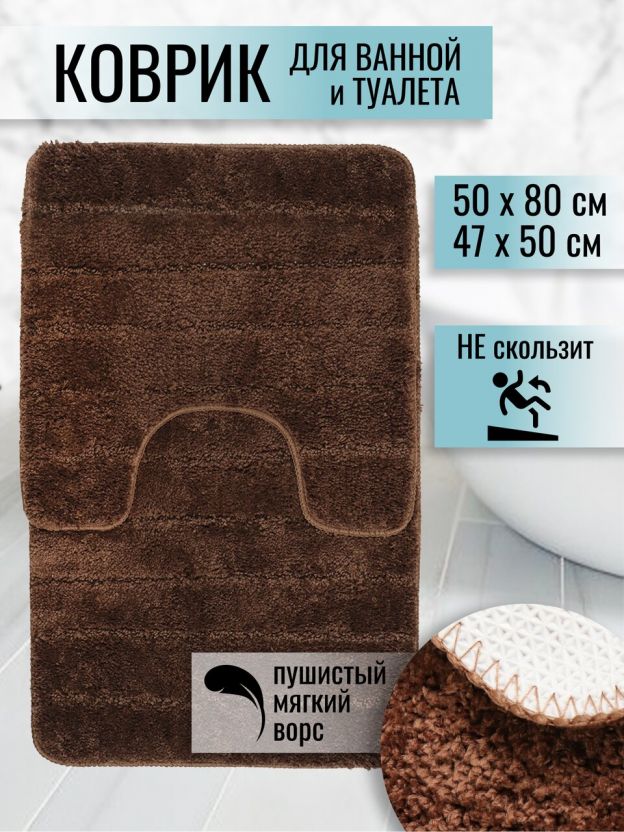Набор ковриков для ванной и туалета, антискользящий, 2 шт, 0.5х0.8, 0.47х0.5 м, полиэстер, шоколад, Полосы, TDM5080-03