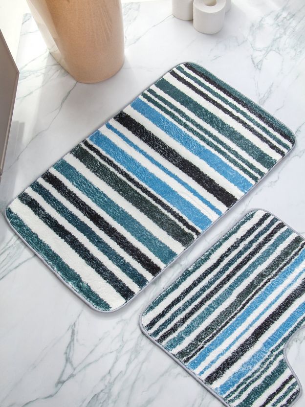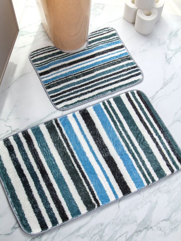 - Комплект ковриков с полосатым рисунком — современный дизайн и максимальный комфорт для ванной и туалета.