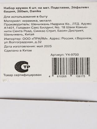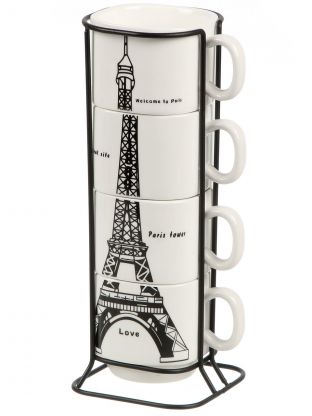 Набор кружек керамика, 4 шт, 200 мл, Эйфелева башня, Daniks, Y4-9700, металлическая подставка