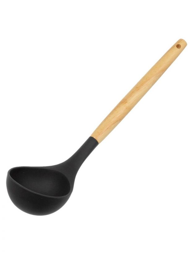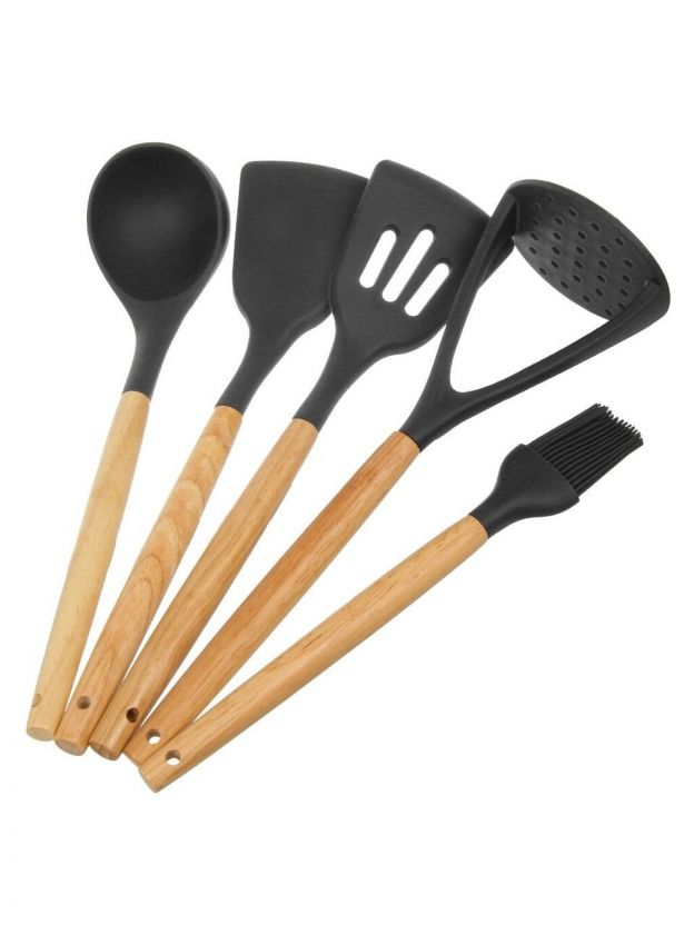 В комплекте предусмотрен удобный пластиковый стакан-подставка – аксессуары всегда под рукой и организованы. Благодаря подвесной конструкции легко поддерживать порядок на кухне, а аксессуары быстро сохнут. Силикон не впитывает запахи и легко очищается, а натуральный бамбук добавляет экологичности и эстетики.
