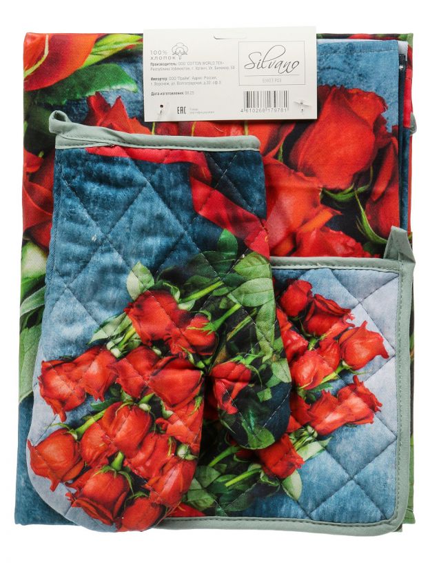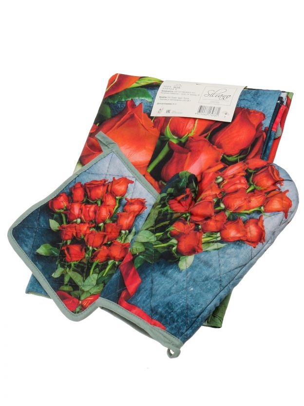 Набор кухонный фартук, прихватка, прихватка-варежка, полотенце, Узбекистан, 100% хлопок, Silvano, букет роз