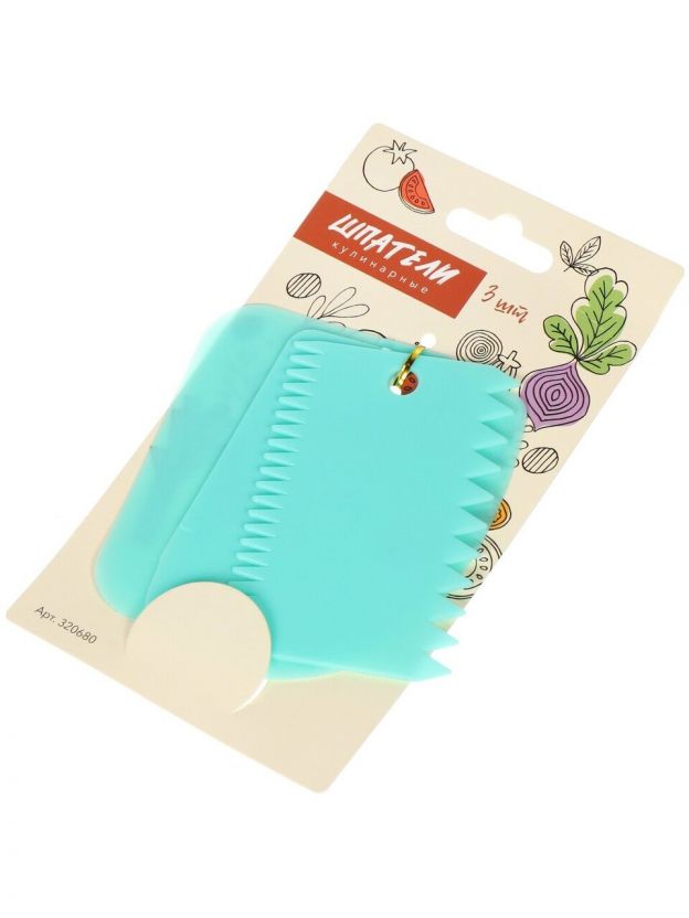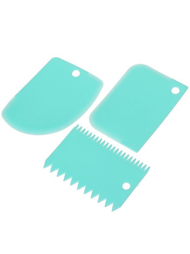 Набор предназначен для декорирования тортов и выпечки. Это прекрасный инструмент для сглаживания неровностей торта, а также для равномерного нанесения крема, сливок и т.п. на торт. С помощью зубчатых сторон шпателей вы сможете нанести рельефные узоры. После применения вымыть мягкой щеткой или губкой, можно с использованием жидких моющих средств. Изготовлено из пластмассы (полипропилен).