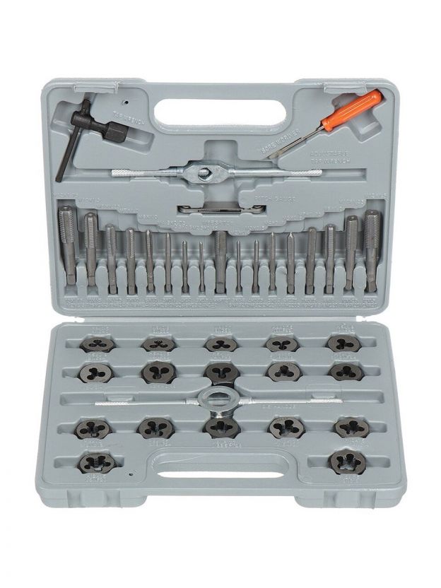 Предназначен для нарезания внешних и внутренних резьб. Состоит из 40 предметов и включает в себя метчики, плашки (М3-М12), плашкодержатели и воротки для метчиков. Принадлежности отличаются высокой прочностью, износостойкостью и устойчивостью к повышенным нагрузкам. Пластиковый кейс облегчает переноску и обеспечивает удобное хранение инструментов.