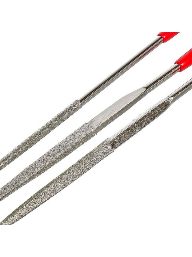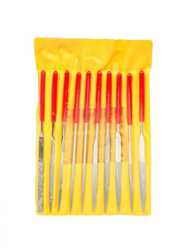 Набор алмазных надфилей применяется для обработки закаленной стали, керамики и других материалов. При работе их необходимо смачивать водой. Подходят для того, чтобы придать необходимую форму краям поверхности изделия. Набор состоит из десяти предметов.