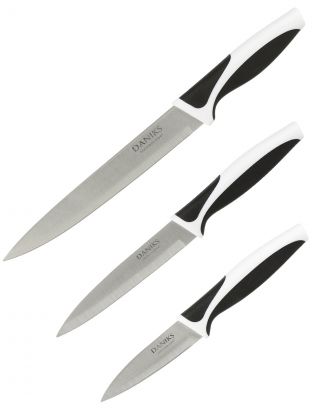 В наборе три ножа: разделочный, универсальный и для овощей. Все изготовлены из нержавеющей стали с чёрной пластиковой рукояткой, без подставки, в блистерной упаковке.