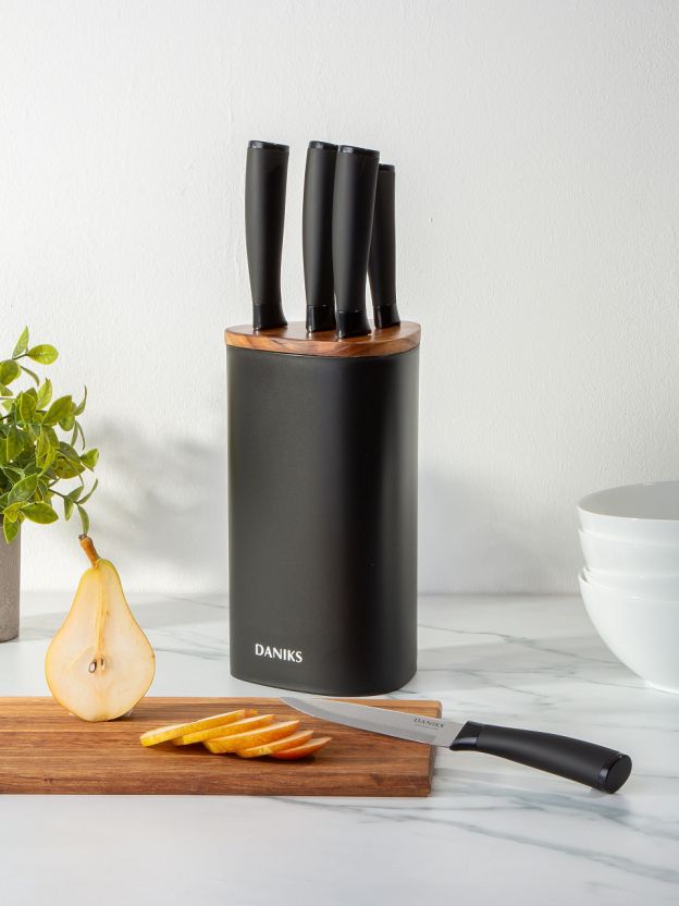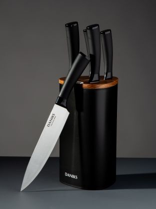 Набор включает шеф-нож, нож для овощей, универсальный нож, хлебный нож и разделочный нож, что позволяет с легкостью справляться с любыми задачами на кухне: от нарезки хлеба до разделки овощей и мяса. Благодаря цельнометаллической конструкции ножи отличаются высокой прочностью и устойчивостью к износу. Стильный черный цвет и современный дизайн подставки органично впишутся в любой интерьер кухни, подчеркивая ее индивидуальность и вкус владельца.