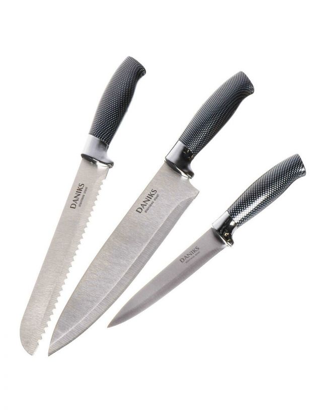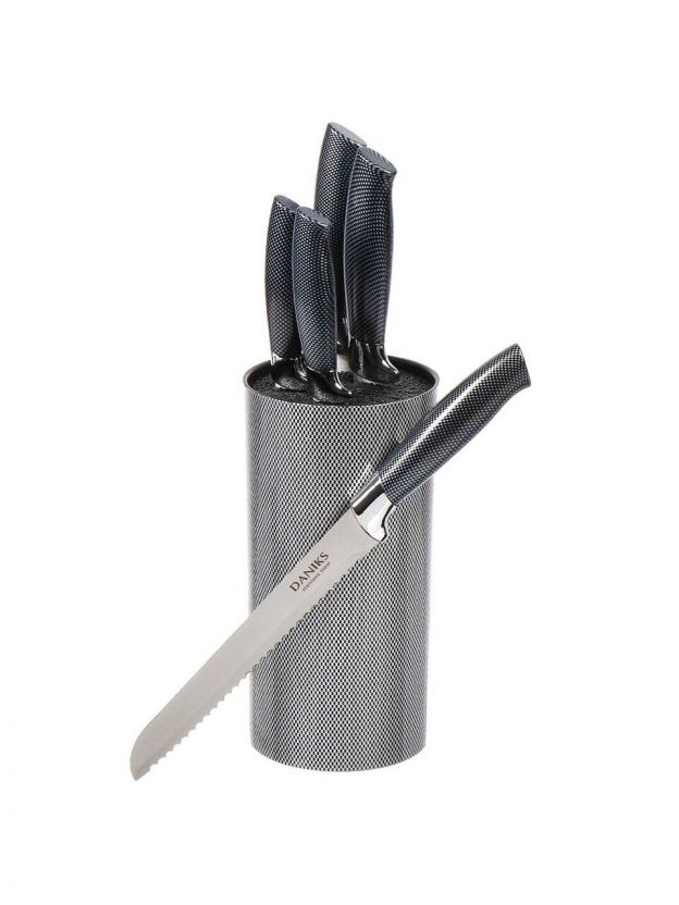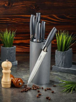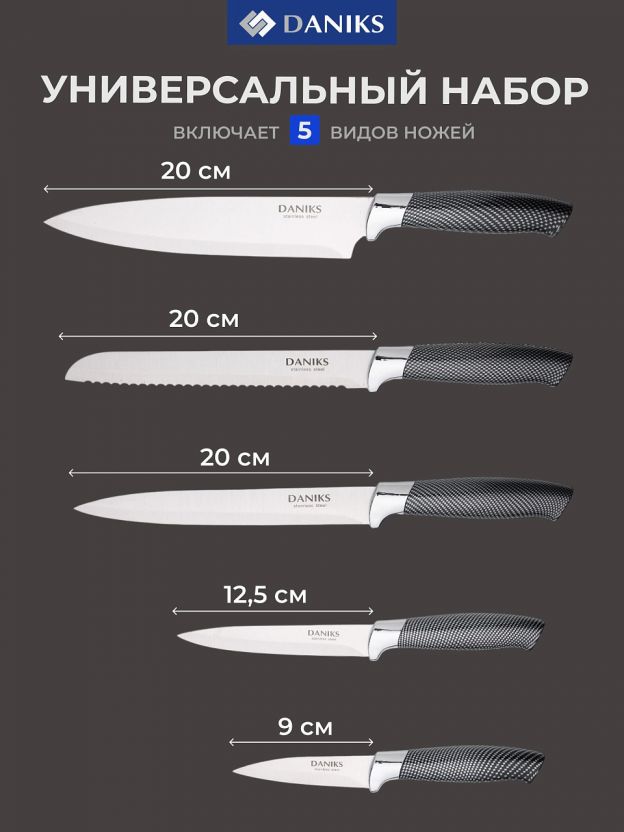 Набор ножей Daniks Оптима — это оптимальный выбор для тех, кто ищет купить недорого набор ножей для дома или дачи с максимальной функциональностью. В комплекте: шеф-нож, универсальный, хлебный, овощной и разделочный ножи длиной от 9 до 20 см, а также устойчивая подставка из нержавеющей стали. Такой набор легко отвечает на вопрос «какой нож выбрать для кухни» — ведь здесь есть всё для нарезки мяса, овощей, хлеба и других продуктов.