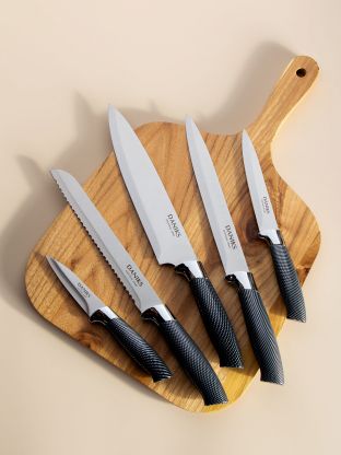 - Полный набор: 5 острых ножей из нержавеющей стали и стильная подставка — всё, что нужно для готовки;