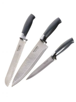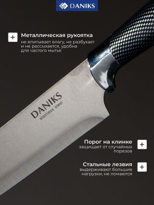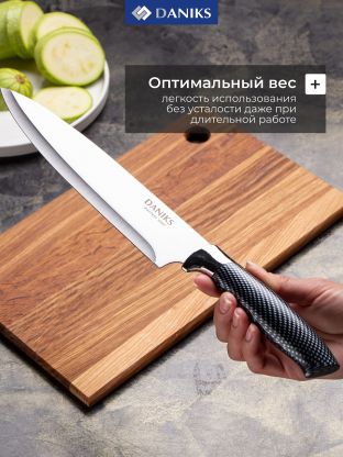 Как использовать ножи Daniks? Просто выберите подходящий размер для задачи: шеф-нож для крупных кусков, универсальный для повседневной готовки, овощной и хлебный — для специальных задач. Благодаря сбалансированной конструкции и эргономике, работать с набором удобно даже при длительной нарезке.